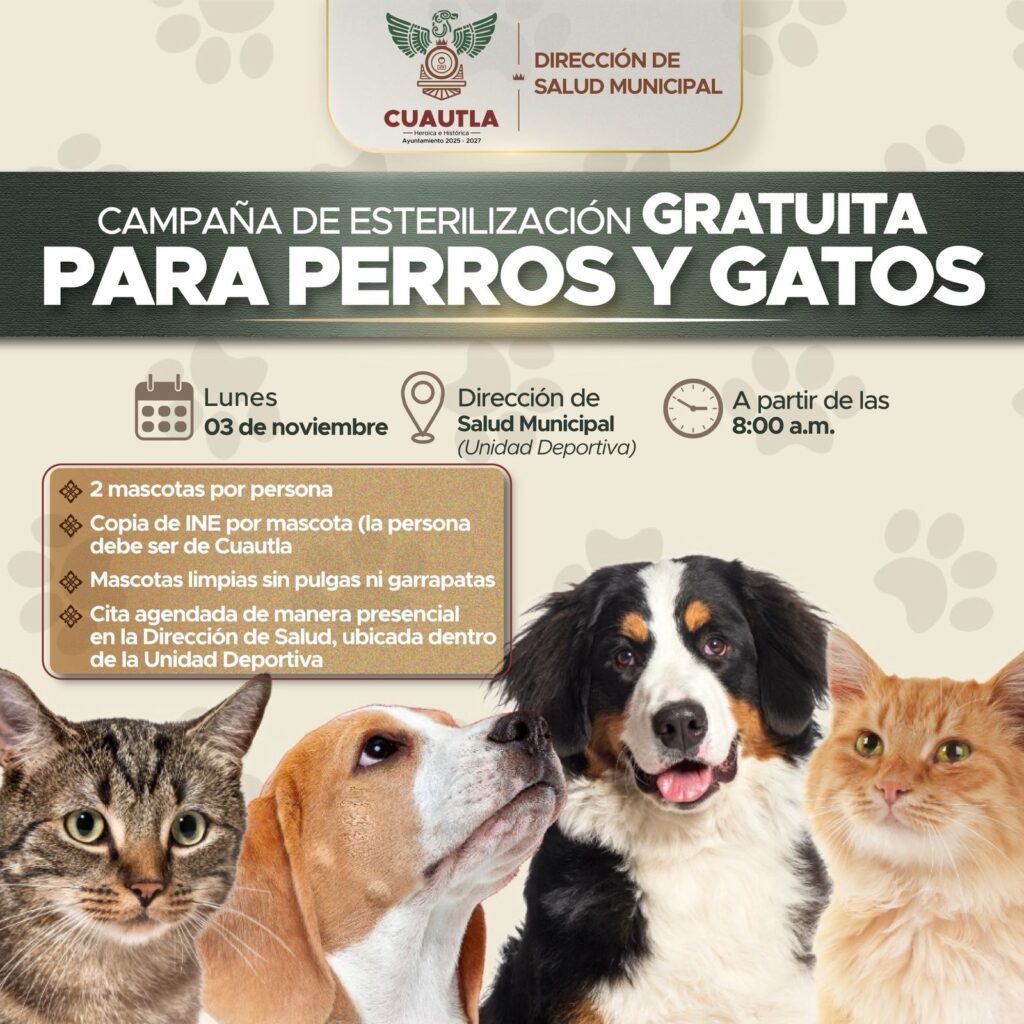 Cuautla, Morelos; 29 de octubre de 2025. El Ayuntamiento de Cuautla, que preside el alcalde Jesús Corona Damián, a través de la Dirección de Salud Municipal, en coordinación con la Jurisdicción Sanitaria III, invita a la ciudadanía a participar en una nueva jornada gratuita de esterilización canina y felina, que se llevará a cabo el lunes 3 de noviembre a partir de las 08:00 horas dentro de las oficinas de Salud Municipal, ubicadas en la Unidad Deportiva José María Morelos y Pavón.