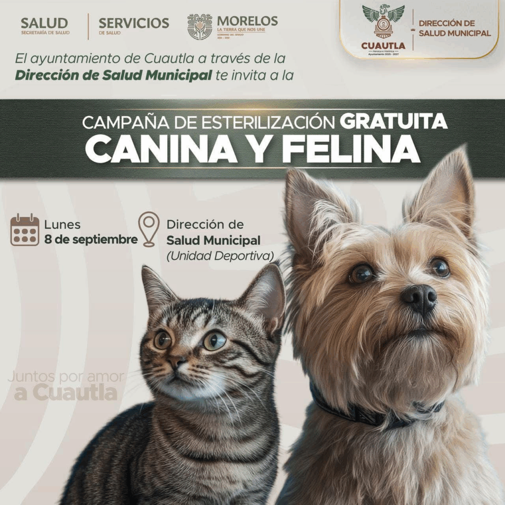 Cuautla, Morelos; 06 de septiembre de 2025. El Gobierno Municipal de Cuautla, a través de la Dirección de Salud Municipal, continúa fortaleciendo las acciones en favor de la salud pública y el bienestar animal mediante la organización de jornadas gratuitas de esterilización canina y felina.