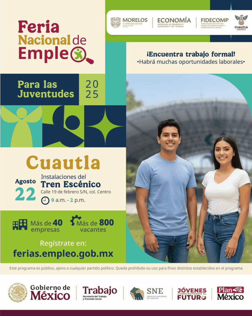 Cuautla, Morelos; 16 de agosto de 2025. El Ayuntamiento de Cuautla, en coordinación con el Gobierno del Estado de Morelos, el Gobierno Federal y la Dirección de Desarrollo Económico, invita a todas y todos los jóvenes a participar en la Feria Nacional de Empleo para las Juventudes 2025.