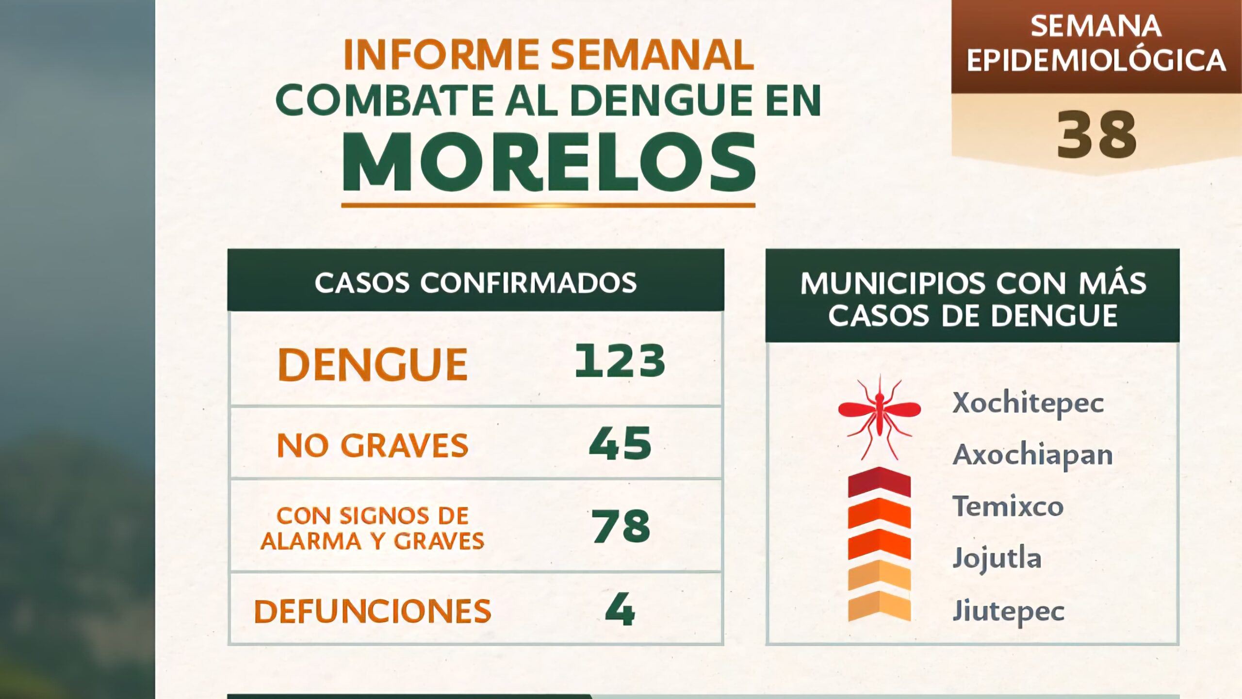 De acuerdo con el panorama epidemiológico de la semana número 38, en Morelos se han confirmado 123 casos de dengue y cuatro lamentables defunciones. Los municipios con mayor incidencia son Xochitepec, Axochiapan, Temixco, Jojutla y Jiutepec.