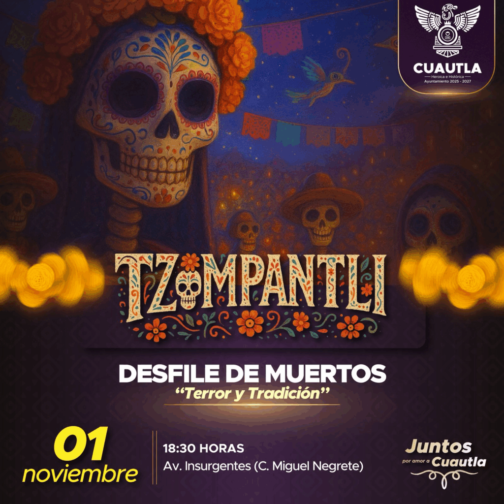 Cuautla, Morelos; 30 de octubre de 2025. El Ayuntamiento de Cuautla, que preside el alcalde Jesús Corona Damián, invita a toda la ciudadanía a participar y disfrutar del gran desfile de Día de Muertos “Terror y Tradición”, que se llevará a cabo este sábado 01 de noviembre en el marco del Festival Tzompantli 2025.
