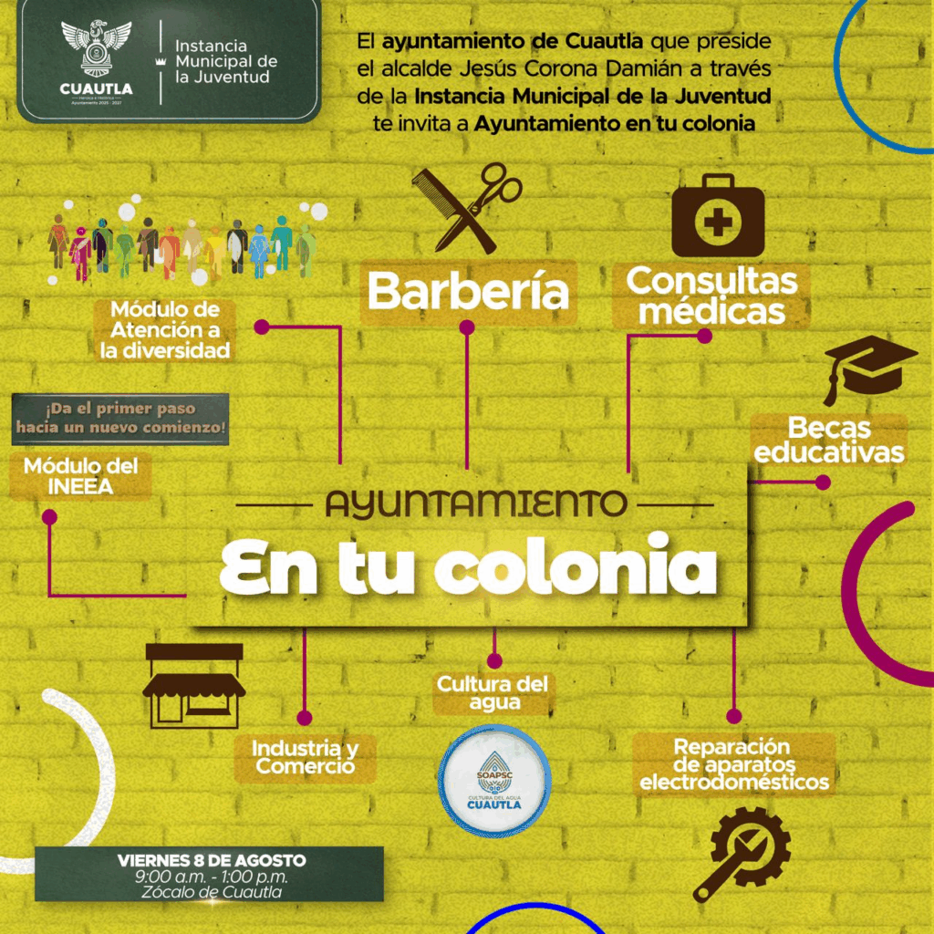 Cuautla, Mor; 07 de agosto de 2025. El Ayuntamiento de Cuautla, a través de la Instancia de la Juventud hizo la invitación a la ciudadanía a asistir a la Jornada de Asistencia Social, que se llevará a cabo este viernes 08 de agosto a partir de las 09:00 horas en la Plaza José María Morelos y Pavón (Zócalo).