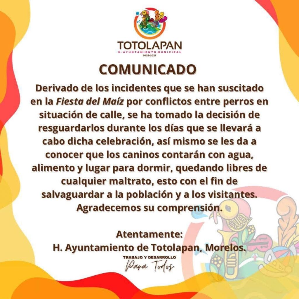 Totolapan, Morelos; 10 de octubre del 2025 – El Ayuntamiento de Totolapan tomó la decisión de encerrar a los perros callejeros de la localidad mientras se lleva a cabo la Fiesta del Maíz, la cual dio inicio este jueves. La medida, informada a través de un comunicado oficial, tiene como objetivo principal evitar incidentes y peleas entre los animales que puedan poner en riesgo a los ciudadanos y asistentes a la feria.