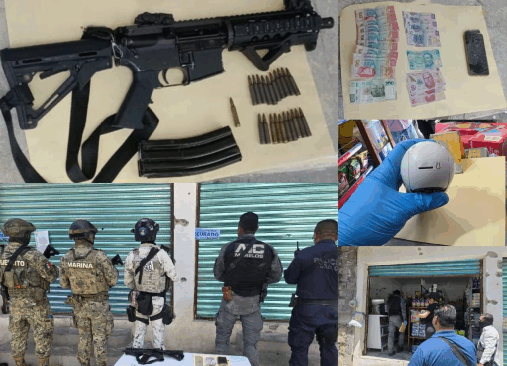Una vez al interior del predio, personal de la Coordinación General de Servicios Periciales encontró en la tienda una cámara de vigilancia, dinero en efectivo, un teléfono celular y fragmentos de bala. Asimismo, en el local comercial adjunto, se halló, escondida entre ropas, un arma larga con cargador y varios cartuchos integrados.