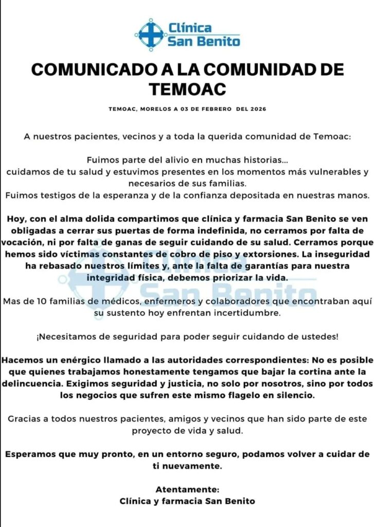 Temoac, Morelos; 06 de febrero 2026 – ​El municipio de Temoac, enfrenta un duro golpe a su sistema de salud tras el anuncio oficial del cierre indefinido de la Clínica y Farmacia San Benito. A través de un emotivo comunicado emitido este 3 de febrero, la institución informó que la decisión no responde a una falta de vocación o recursos, sino a la insostenible situación de inseguridad que atraviesan, señalando directamente ser víctimas constantes de extorsiones y el delito de «cobro de piso».​