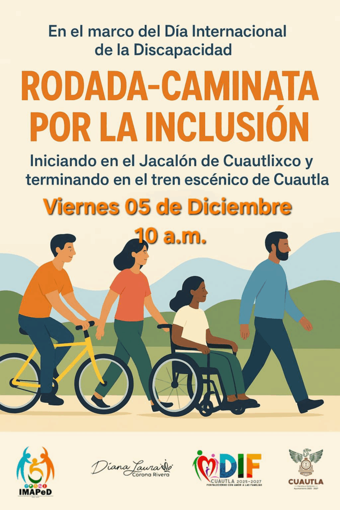 Cuautla, Morelos; 24 de noviembre de 2025.Con el propósito de promover una cultura de respeto, igualdad y participación para todas las personas, el Ayuntamiento de Cuautla invita a la ciudadanía a sumarse a la Rodada–Caminata por la Inclusión, actividad organizada en el marco del Día Internacional de la Discapacidad.