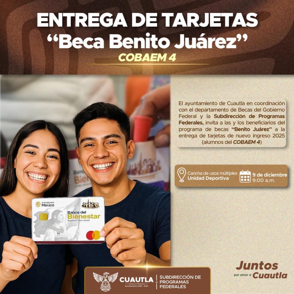 Cuautla, Morelos; 08 de diciembre de 2025. El Ayuntamiento de Cuautla, encabezado por el alcalde Jesús Corona Damián, anunció que este martes 9 de diciembre se llevará a cabo la entrega de tarjetas de nuevo ingreso 2025 del Programa de Becas Benito Juárez para estudiantes del COBAEM Plantel 4, donde 394 alumnas y alumnos resultarán beneficiados, una de las entregas más numerosas del ciclo.