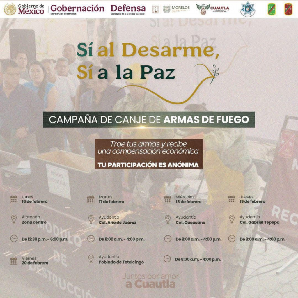 Cuautla, Morelos; 14 de febrero de 2026. Cuautla será el primer municipio del estado en implementar la Campaña Nacional “Sí al Desarme, Sí a la Paz”, una estrategia enfocada en el desarme voluntario como medida preventiva para reducir riesgos y fortalecer la seguridad en las colonias.