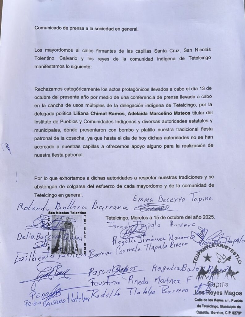 Cuautla, Morelos; 15 de octubre 2025 – Los mayordomos de las capillas de la Santa Cruz, San Nicolás Tolentino, Calvario y Los Reyes, pertenecientes a la comunidad indígena de Tetelcingo en Cuautla, han alzado la voz para denunciar públicamente a la delegada política, Liliana Chimal, por lo que califican como un engaño y apropiación del esfuerzo comunitario.
