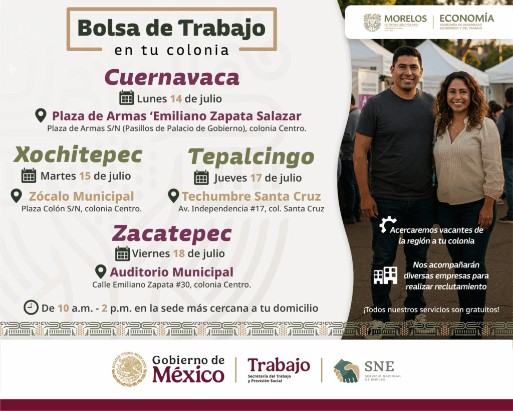 - Del 14 al 18 de julio se llevará a cabo la estrategia “Bolsa de Trabajo en tu Colonia”, en comunidades de Cuernavaca, Xochitepec, Tepalcingo y Zacatepec
