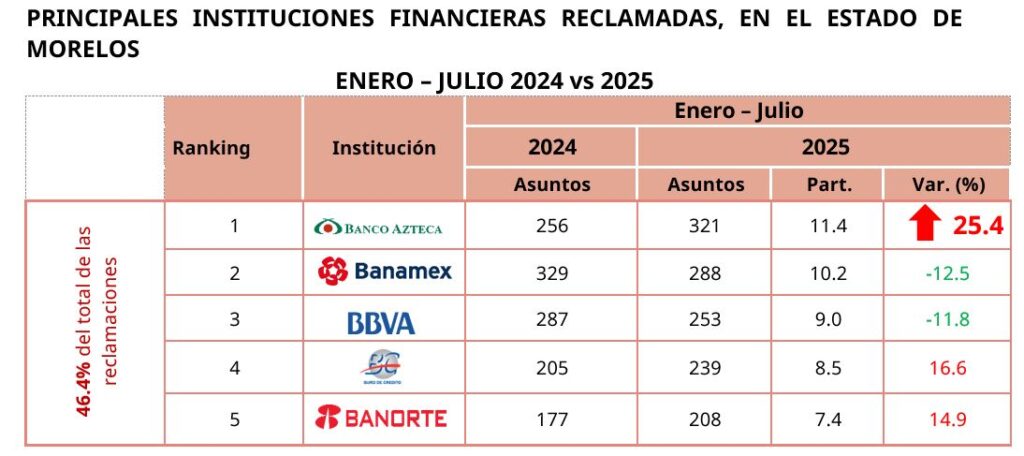 Cuernavaca, Morelos; 19 de agosto 2025 – La Comisión Nacional para la Protección y Defensa de los Usuarios de Servicios Financieros (CONDUSEF) informó que, de enero a julio de 2025, se atendieron 2,821 reclamaciones en el estado de Morelos, lo que representa un aumento del 4.1% en comparación con el mismo periodo de 2024. Este estado concentró el 1.9% del total de quejas a nivel nacional.