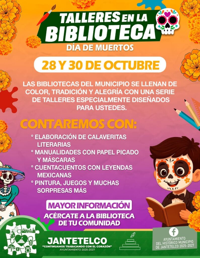 Jantetelco , Morelos; 27 de octubre de 2025. El Presidente Municipal de Jantetelco, Ángel Augusto Domínguez Sánchez, y las bibliotecas de las diferentes comunidades extienden una cordial invitación a la población a participar en los Talleres por el Día de Muertos.