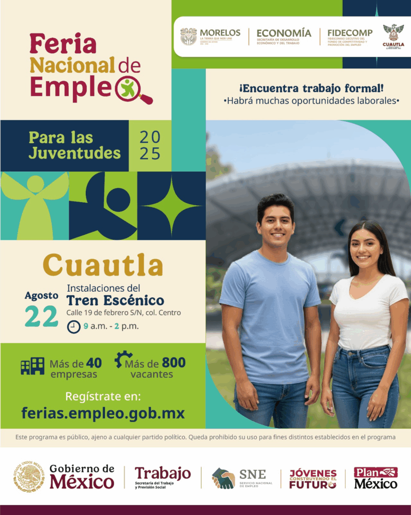 Cuautla, Morelos; 20 de agosto de 2025- El Gobierno de Morelos, a través de la Secretaría de Desarrollo Económico y del Trabajo (SDEyT) y el Servicio Nacional de Empleo (SNE) Morelos, convoca a buscadores de oportunidades laborales y a empresas a participar en la Feria Nacional de Empleo para las Juventudes Cuautla 2025, que se realizará el viernes 22 de agosto en las instalaciones del Tren Escénico.