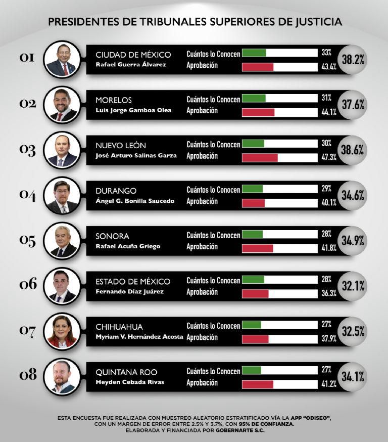 Los resultados de la encuesta de GobernArte, que utilizó una metodología de muestreo aleatorio estratificado a través de la aplicación Odiseo, destacan el liderazgo del Magistrado Rafael Guerra Álvarez, Presidente del Poder Judicial de la Ciudad de México, quien también preside la Comisión Nacional de Tribunales Superiores de Justicia de los Estados Unidos Mexicanos (CONATRIB). Su gestión ha sido reconocida por su trabajo en la modernización y transparencia del sistema judicial capitalino.Junto a él, el Magistrado José Arturo Salinas Garza de Nuevo León y el Magistrado Luis Jorge Gambóa Olea de Morelos obtuvieron puntuaciones destacadas, lo que resalta la labor de sus respectivas administraciones en la impartición de justicia en sus estados.