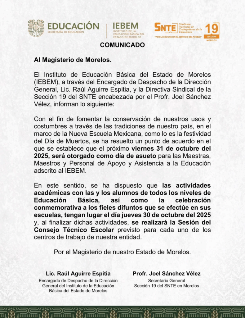 Cuernavaca, Morelos; 29 de octubre 2025 – El ambiente festivo del Día de Muertos se adelanta para las familias de Morelos, pues se ha confirmado que no habrá clases este viernes 31 de octubre en todas las escuelas de Educación Básica del estado. El Instituto de Educación Básica del Estado de Morelos (IEBEM) y la dirigencia de la Sección 19 del Sindicato Nacional de Trabajadores de la Educación (SNTE) llegaron a un acuerdo para otorgar este día de descanso a maestros y personal de apoyo. Aunque la medida carece de un fundamento legal en el calendario oficial, las autoridades educativas y sindicales la justifican en la necesidad de que el magisterio pueda fomentar y conservar los usos y costumbres nacionales bajo el espíritu de la Nueva Escuela Mexicana, permitiendo a miles de trabajadores prepararse y vivir a plenitud la tradición.