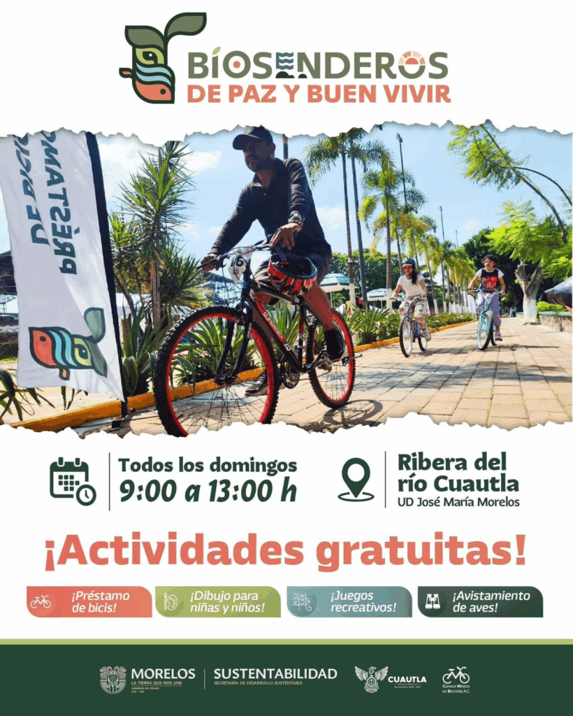 Cuautla, Morelos; 25 de octubre de 2025 – Con el propósito de fortalecer la unión familiar, promover la cultura ambiental y fomentar una convivencia armónica con la naturaleza, el Ayuntamiento de Cuautla, que preside el alcalde Jesús Corona Damián, en coordinación con la Secretaría de Desarrollo Sustentable del Estado, invita a la ciudadanía a participar en la tercera edición de “Biosenderos de Paz y Buen Vivir”.