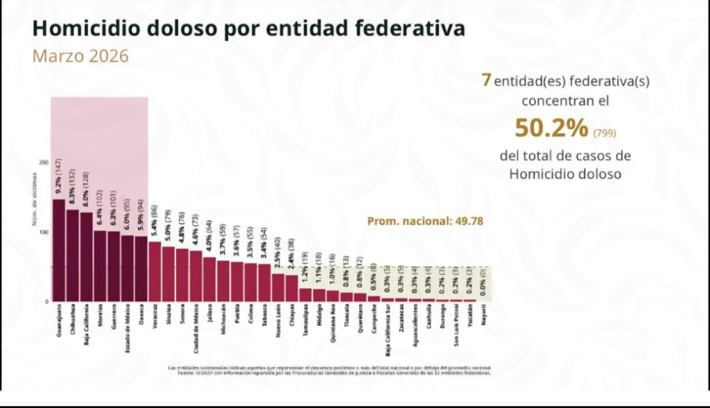 En contraste, Guanajuato encabezó la lista con 147 homicidios, equivalente al 9.2 por ciento, posicionándose como la entidad con mayor incidencia en este delito.