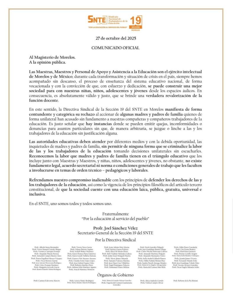En un comunicado de prensa, el SNTE exigió al Instituto de Educación Básica del Estado de Morelos (IEBEM) actuar conforme a derecho y garantizar procesos justos para los docentes.