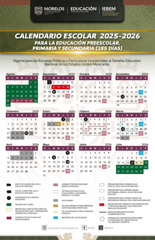 Cuernavaca, Morelos; 09 de agosto 2025 – El director general del Instituto de la Educación Básica del Estado de Morelos (IEBEM), Leandro Vique Salazar, presentó el Calendario Escolar para el Ciclo Escolar 2025-2026, el cual consta de 185 días de clases aplicables en todas las escuelas de Preescolar, Primaria y Secundaria en el territorio morelense y de 190 días efectivos de actividades escolares para Educación Normal y la formación de las maestras y maestros.