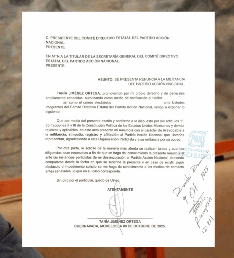 ​La renuncia de Jiménez Ortega fue formalizada ante el Comité Directivo Estatal del PAN en Cuernavaca, Morelos, el 08 de octubre de 2025. En el documento, la ahora exmilitante agradeció a la organización partidista y a su militancia por su apoyo.
