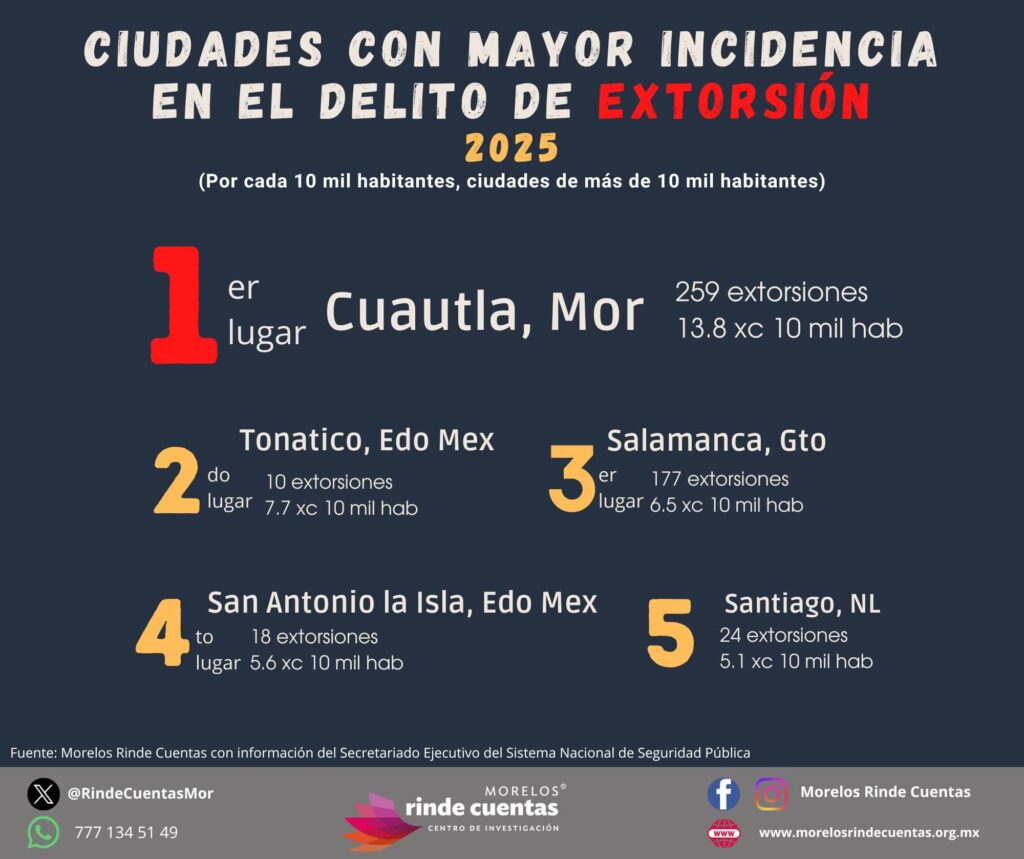 Cuautla, Morelos; 20 de enero 2026 – La ciudad de Cuautla, Morelos, atraviesa una crisis de seguridad sin precedentes al posicionarse en el primer lugar nacional en incidencia del delito de extorsión durante 2025. De acuerdo con el análisis de la organización Morelos Rinde Cuentas, la demarcación registró un total de 259 casos denunciados, lo que arroja una alarmante tasa de 13.8 extorsiones por cada 10 mil habitantes. Esta cifra sitúa a Cuautla muy por encima del promedio de otras zonas críticas del país, evidenciando una problemática institucional y de seguridad que afecta directamente la economía local.