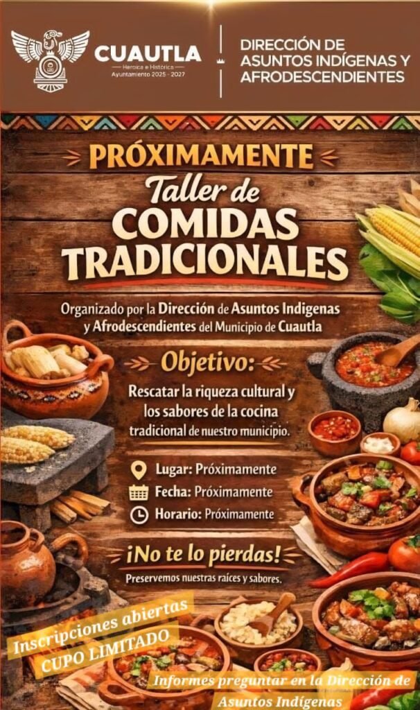 Cuautla, Morelos, 24 de diciembre de 2025. Con la finalidad de rescatar y fortalecer la riqueza gastronómica del municipio, el Ayuntamiento de Cuautla, encabezado por el alcalde Jesús Corona Damián, anunció la realización del Taller de Comidas Tradicionales, iniciativa coordinada por la Dirección de Asuntos Indígenas y Afrodescendientes.